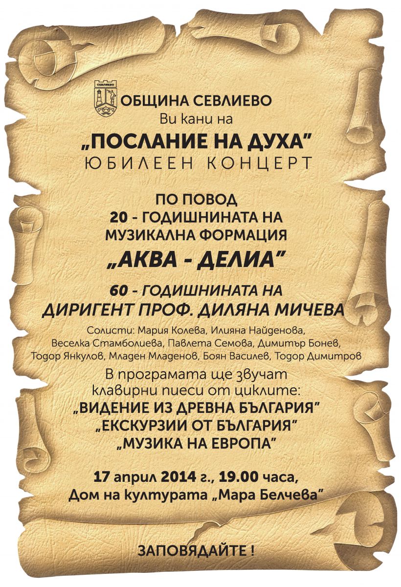 На 17 април 2014 година от 19.00 часа в ДК „Мара Белчева“ световноизвестната българска хорова формация "АКВА-ДЕЛИА" с диригент проф. Диляна Мичева ще изнесе концерта „ПОСЛАНИЕ НА ДУХА“. Красивите гласове на талантливите изпълнители от "АКВА-ДЕЛИА" ще зарадват севлиевската публика за великденските празници.