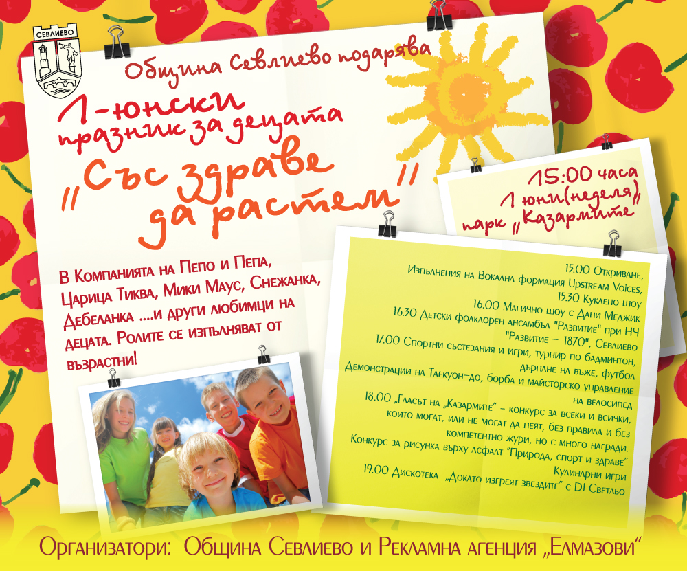 „Със здраве да растем“ е мотото на таз годишния празник, който организира Община Севлиево по повод  Международния ден на детето-1 юни. Денят ще премине с много игри, награди и изненади, конкурси, спортни надпревари и демонстрации.