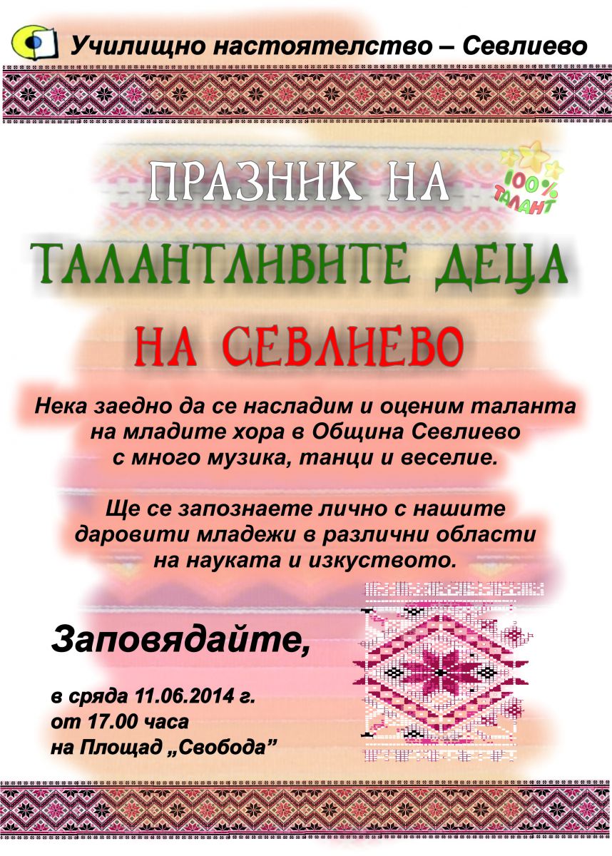 Училищно настоятелство – Севлиево кани севлиевци заедно да споделим гордостта от прекрасните и талантливи деца на Севлиево. Очаква ви един незабравим празник с разходка из дебрите на българския фолклор.