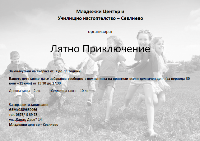 За първа година Младежки център – Севлиево съвместно с УН – Севлиево организират лятно приключение за деца на възраст от 7 до 11 г. Срещу дневна такса от 2 лв. или седмична от 10 лв. организаторите ще ангажират вниманието на вашето дете с игри на открито и занимания в Младежки център.