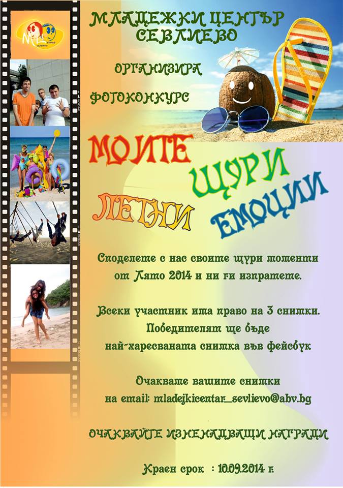 Младежки център – Севлиево организира фотоконкурс на тема „Моите щури летни емоции”. Направете най-интересните и щури фотоси, които запечатват вашите летни преживявания и ги изпратете на електронен адрес mladejkicentar_sevlievo@abv.bg в срок до 10 септември. Всеки участник може да изпрати до 3 снимки, които ще бъдат публикувани във фейсбук профила на Младежки център. Печелят снимките, които съберат най-много харесвания.