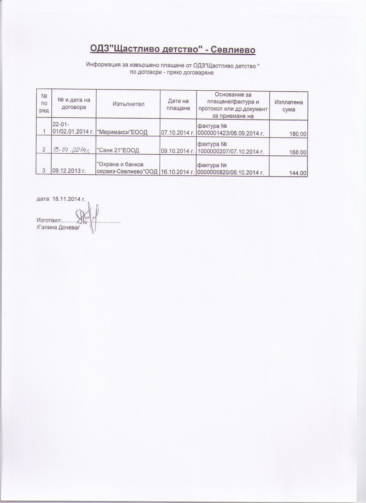 Информация за извършено плащане от ОДЗ "Щастливо детство" по договори - пряко договаряне