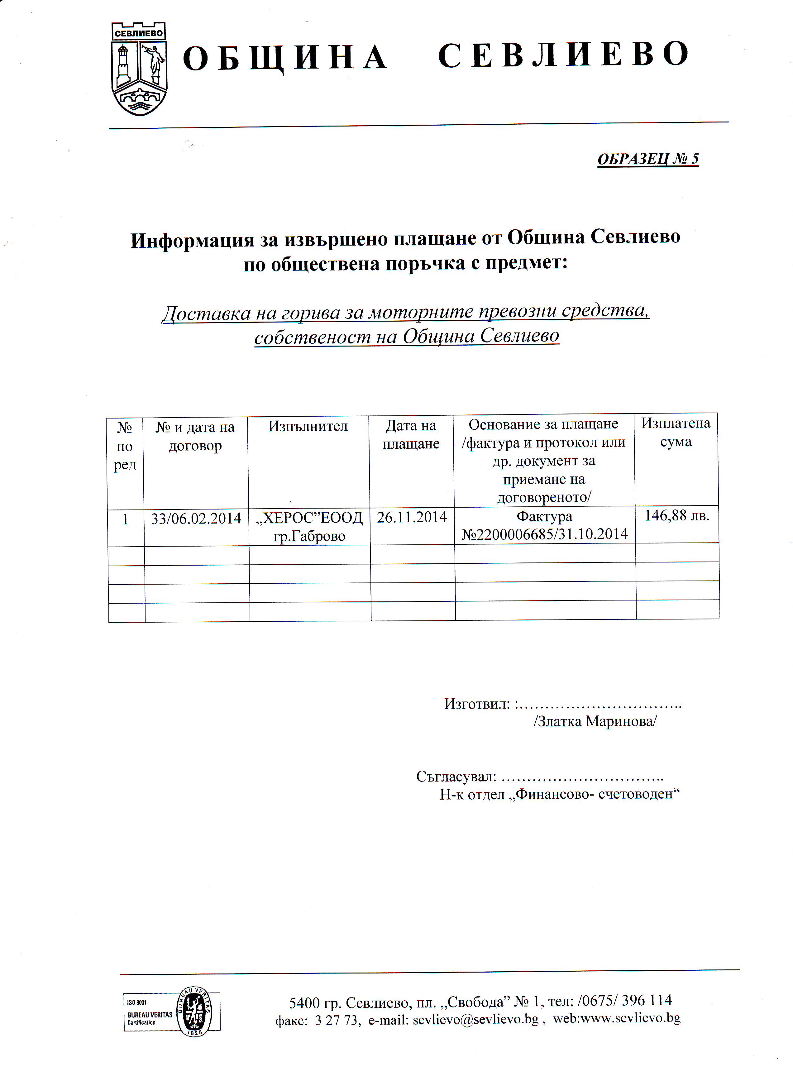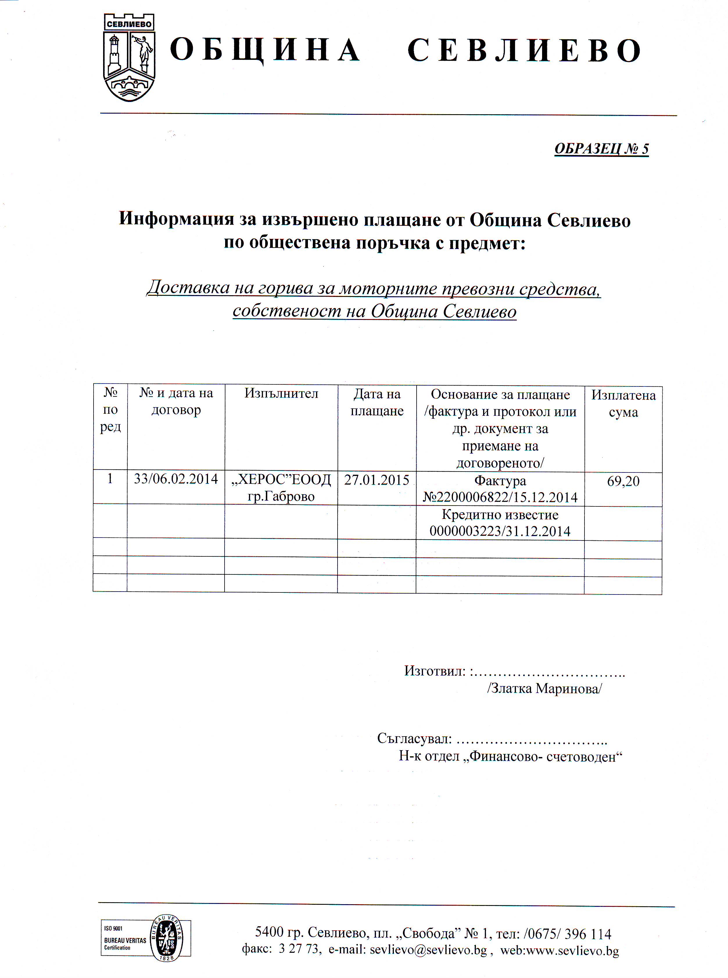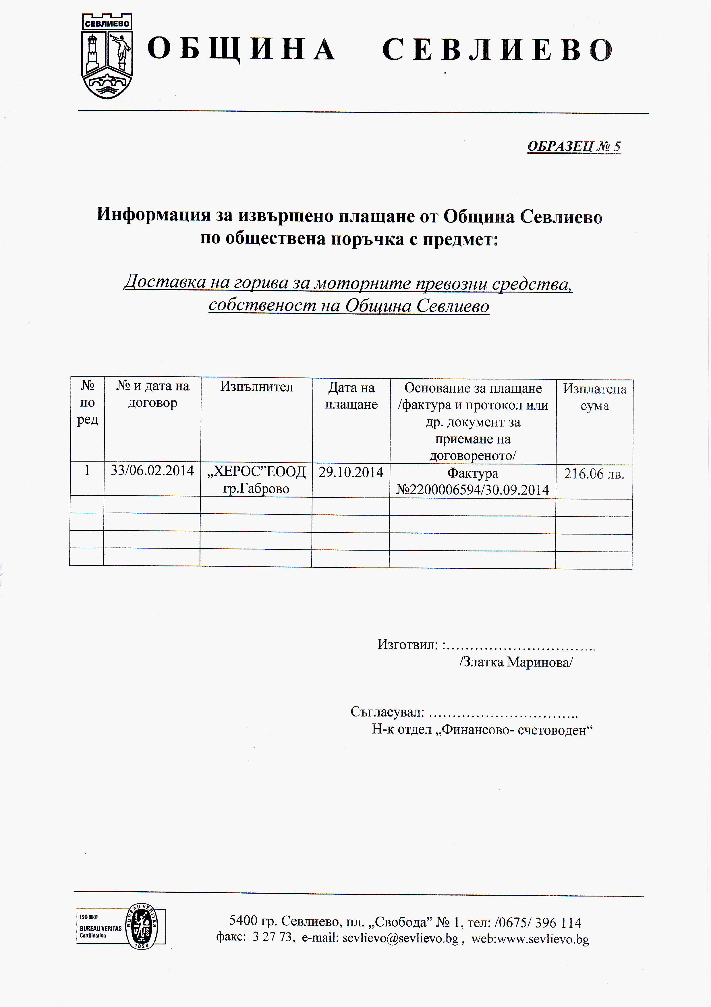 „Доставка на горива за моторните превозни средства, собственост на Община Севлиево”№ 00189-2014-0001
