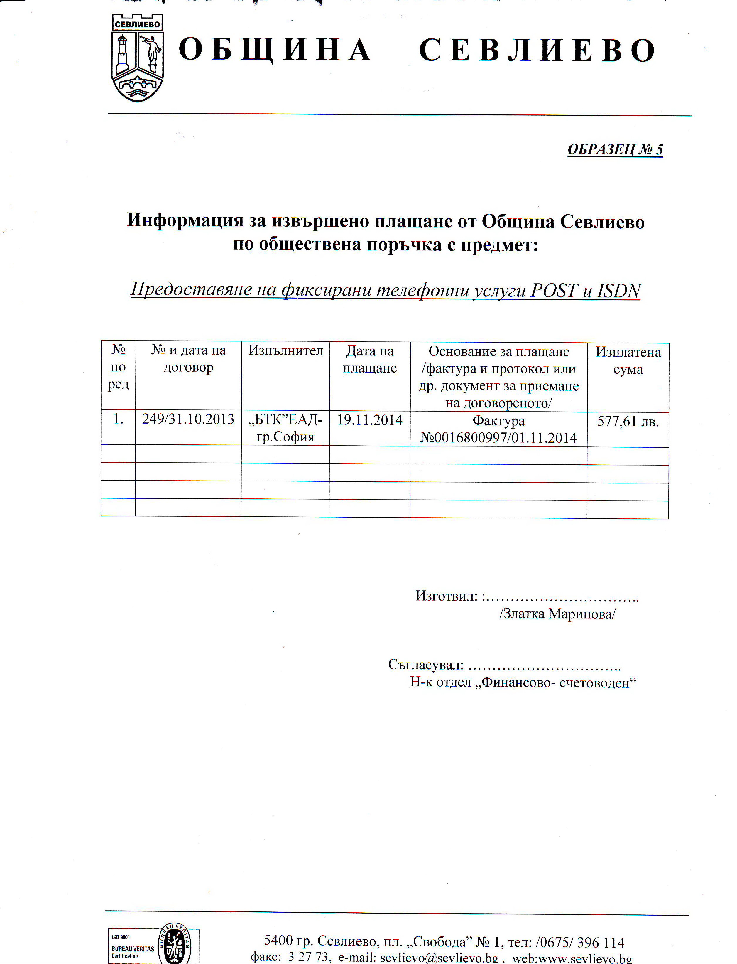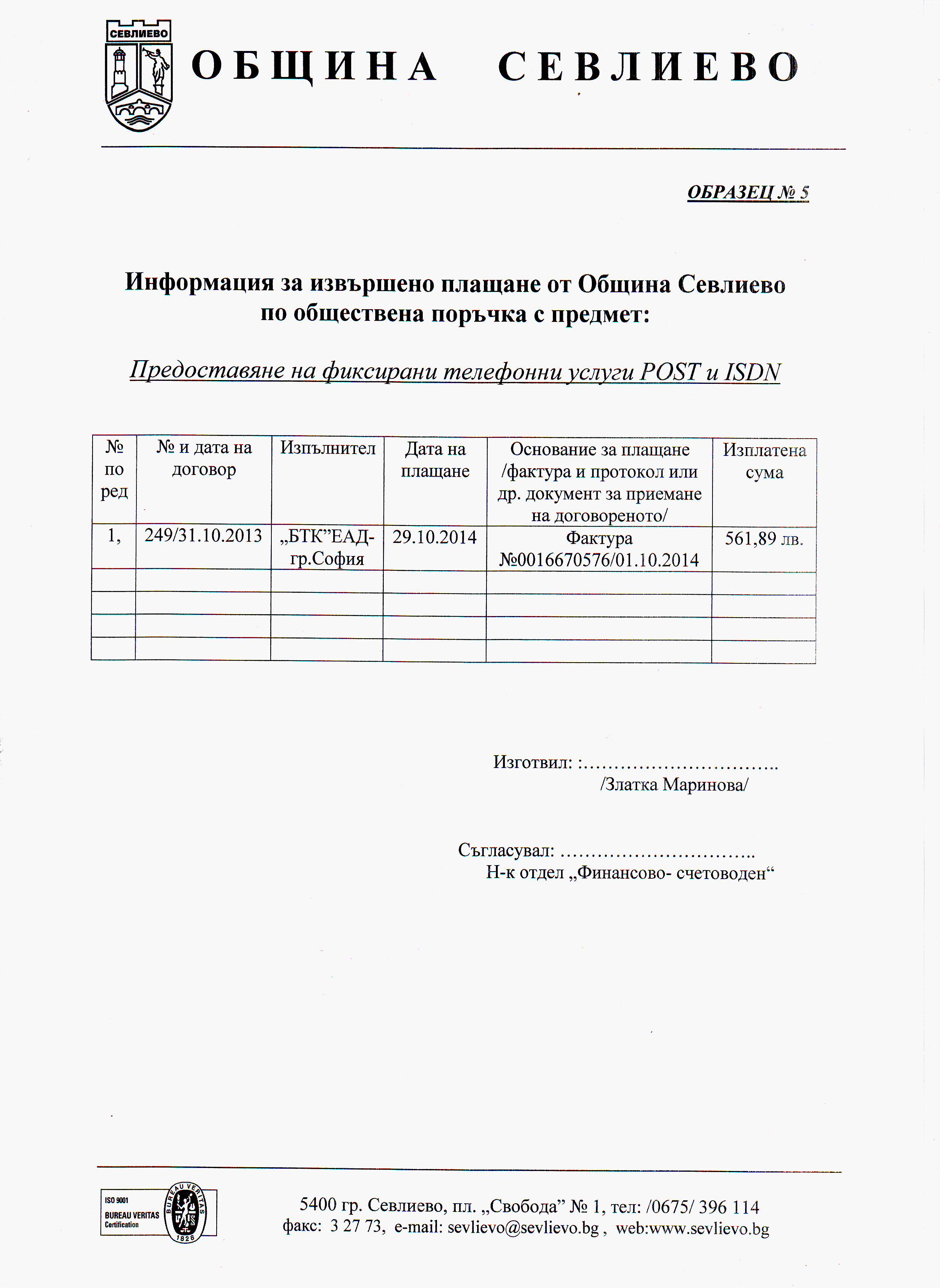 Информация за извършено плащане по договор № 249/ 31.10.13 г. на 16.10.2014 г.