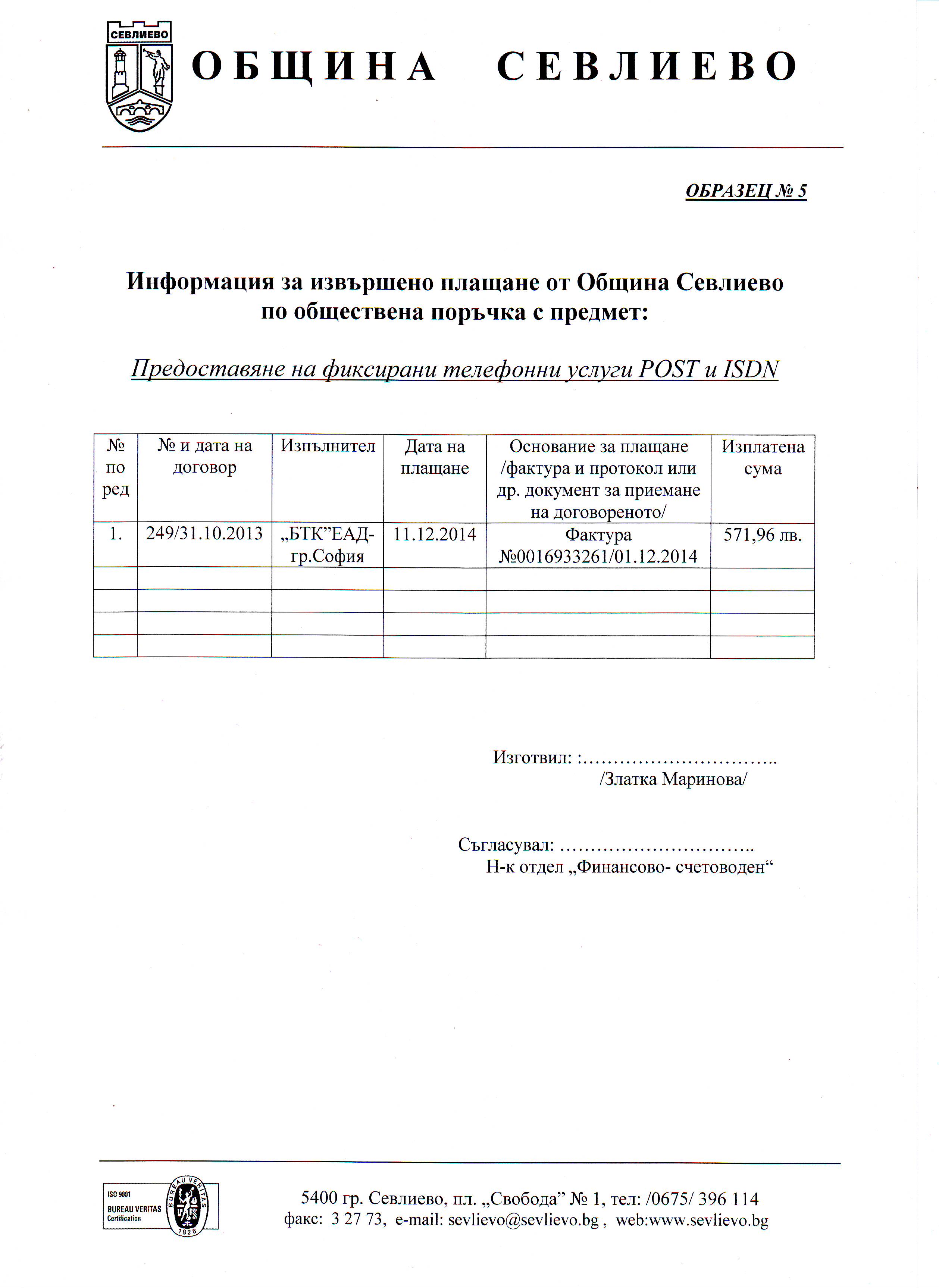 Информация за извършено плащане по договор № 249/ 31.10.13 г. на 12.12.2014 г