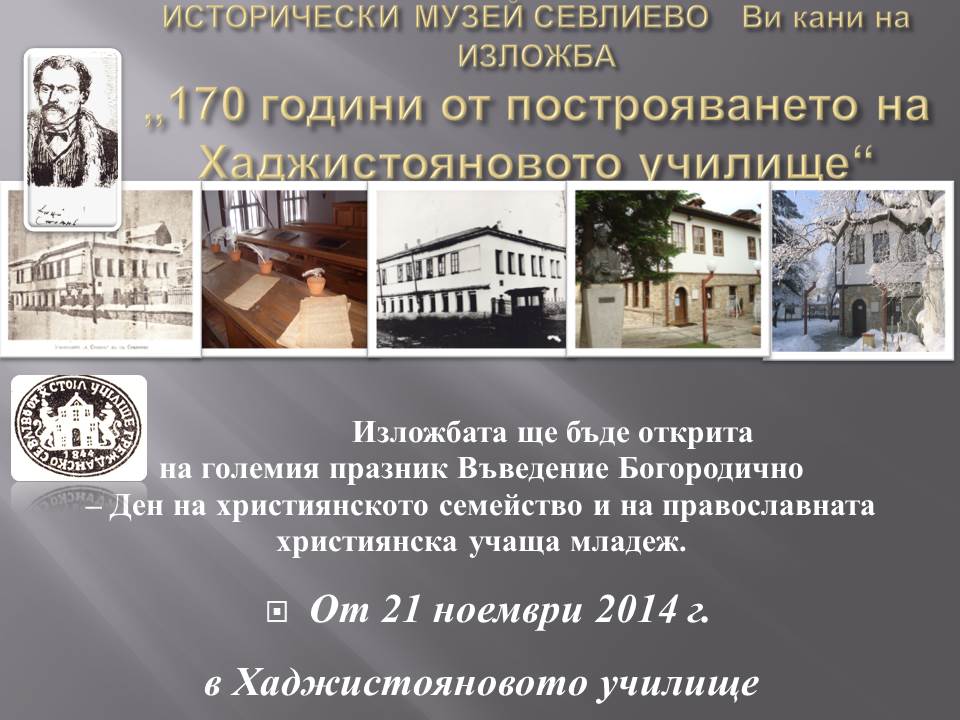 Юбилейна изложба, по повод 170-годишнината от построяването на Хаджистояновото училище ще бъде експонирана в сградата на Историческия музей Севлиево утре, 21 ноември. Изложбата показва интересни документи, предмети, снимки и текстове от построяването на училището и животът на неговия създател. Тя ще бъде на разположени на посетителите до края на годината.