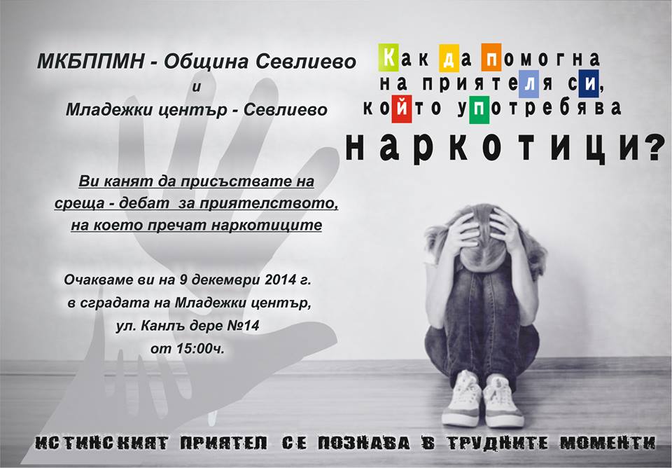 Местната комисия за борба срещу противообществените прояви на малолетните и непълнолетните при Община Севлиево и Младежки център - Севлиево организират среща-дебат на тема „Как да помогнем на приятел, който употребява наркотици?”.
