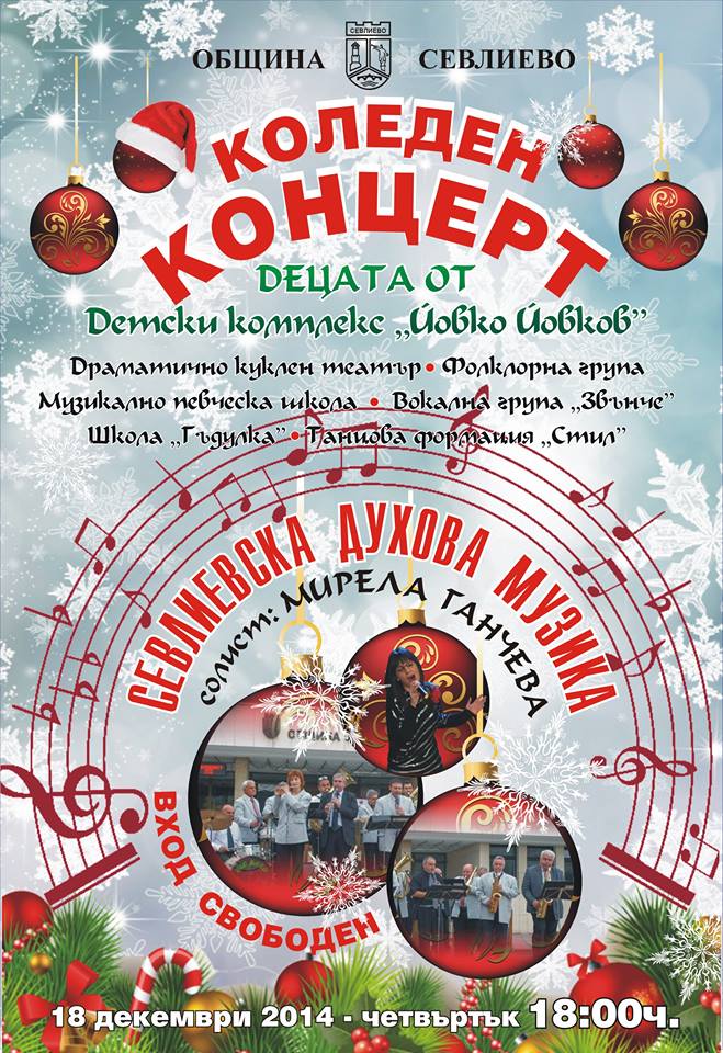 Съвместен Коледен концерт на децата от Детски комплекс „Йовко Йовков” – Севлиево и Севлиевската духова музика и ще се проведе утре, 18 декември от 18.00 часа в ДК „Мара Белчева“. В концерта ще вземат участие солистката Мирела Ганчева и съставите от драматично куклен театър, фолклорна група, музикално певческа школа, вокална група „Звънче“, школата по „Гъдулка“ и танцова формация „Стил“.