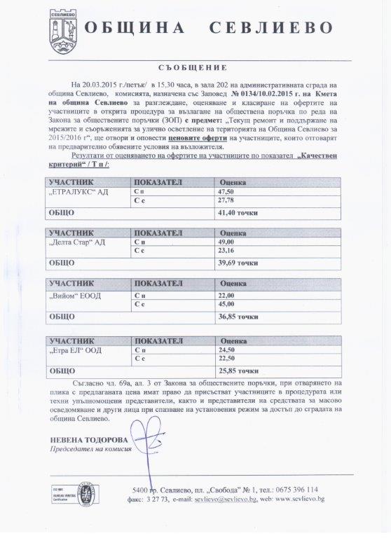 "Текущ ремонт и поддържане на мрежите и съоръженията за улично осветление на територията на община Севлиево за 2015/2016г.” № 00189-2014-0011