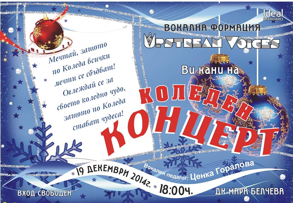 Вокална формация “Upstream voices” ще зарадва своите почитатели с традиционния си концерт посветен на коледните празници. Той ще се състои на 19 декември /петък/ от 18.00 часа в ДК „Мара Белчева“. Таз годишният концерт е под мотото „Мечтай, защото по Коледа всички мечти се сбъдват! Оглеждай се, за своето коледно чудо, защото по Коледа стават чудеса!“.
