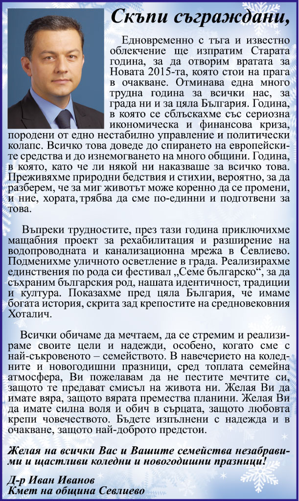 ПОЗДРАВЛЕНИЕ ОТ КМЕТА Д-Р ИВАН ИВАНОВ КЪМ ЖИТЕЛИТЕ НА ОБЩИНА СЕВЛИЕВО ПО ПОВОД НОВОГОДИШНИТЕ ПРАЗНИЦИ