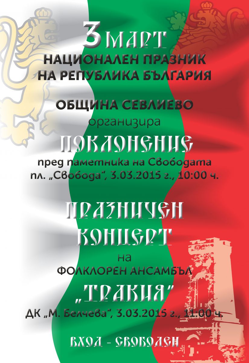Община Севлиево кани всички жители и гости на града на празничното честване по повод навършването на 137 години от Освобождението на България. Програмата ще започне в 9.00 часа на 3 март в Хаджистояновото училище с урок по родолюбие на тема: „Нека таз свобода да ни бъде дар!” и Ден на отворените врати в Исторически музей – Севлиево.