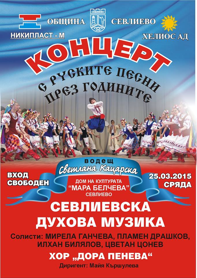 Утре, 25 март /сряда/ от 18.00 часа в ДК „Мара Белчева” ще се проведе празничен концерт „С руските песни през годините”, в изпълнение на Севлиевската духова музика и ход „Дора Пенева”. Солисти на събитието ще бъдат Мирела Ганчева, Пламен Драшков, Илхан Билялов и Цветан Цонев. Диригент: Майя Кършулева.