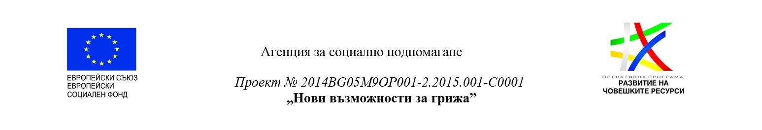 Проект „Нови възможности за грижа” по Процедура за директно предоставяне на безвъзмездна финансова помощ „Нови алтернативи” по приоритетна ос 2 «Намаляване на бедността и насърчаване на социалното изключване» на Оперативна програма «Развитие на човешките ресурси» 2014-2020» стартира изпълнението си на 18 март т.г. Общата стойност на Проекта възлиза на 64 966 534,16 лева и се реализира с финансовата подкрепа на Европейския съюз чрез Европейския социален фонд и национално съфинансиране.