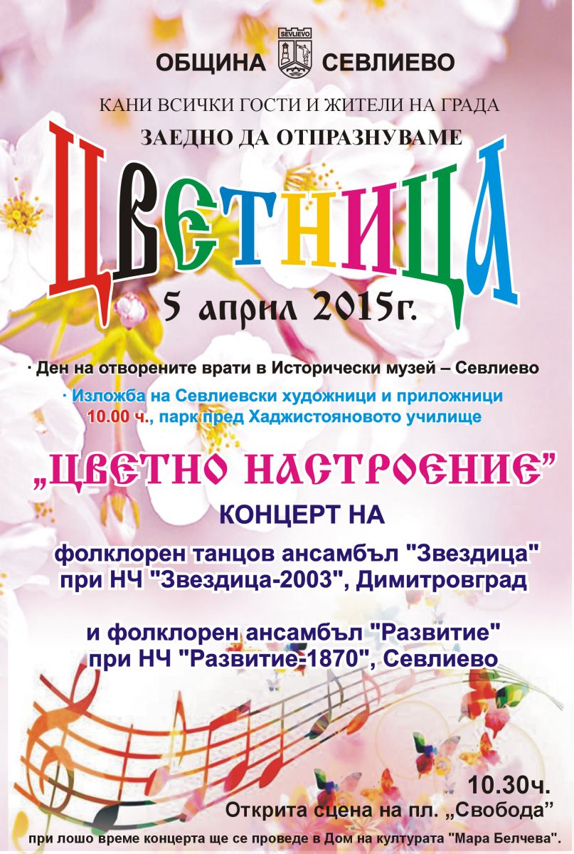 Община Севлиево кани всички жители и гости на града заедно да отпразнуваме един от най-светлите празници – Цветница, на 5 април /неделя/.