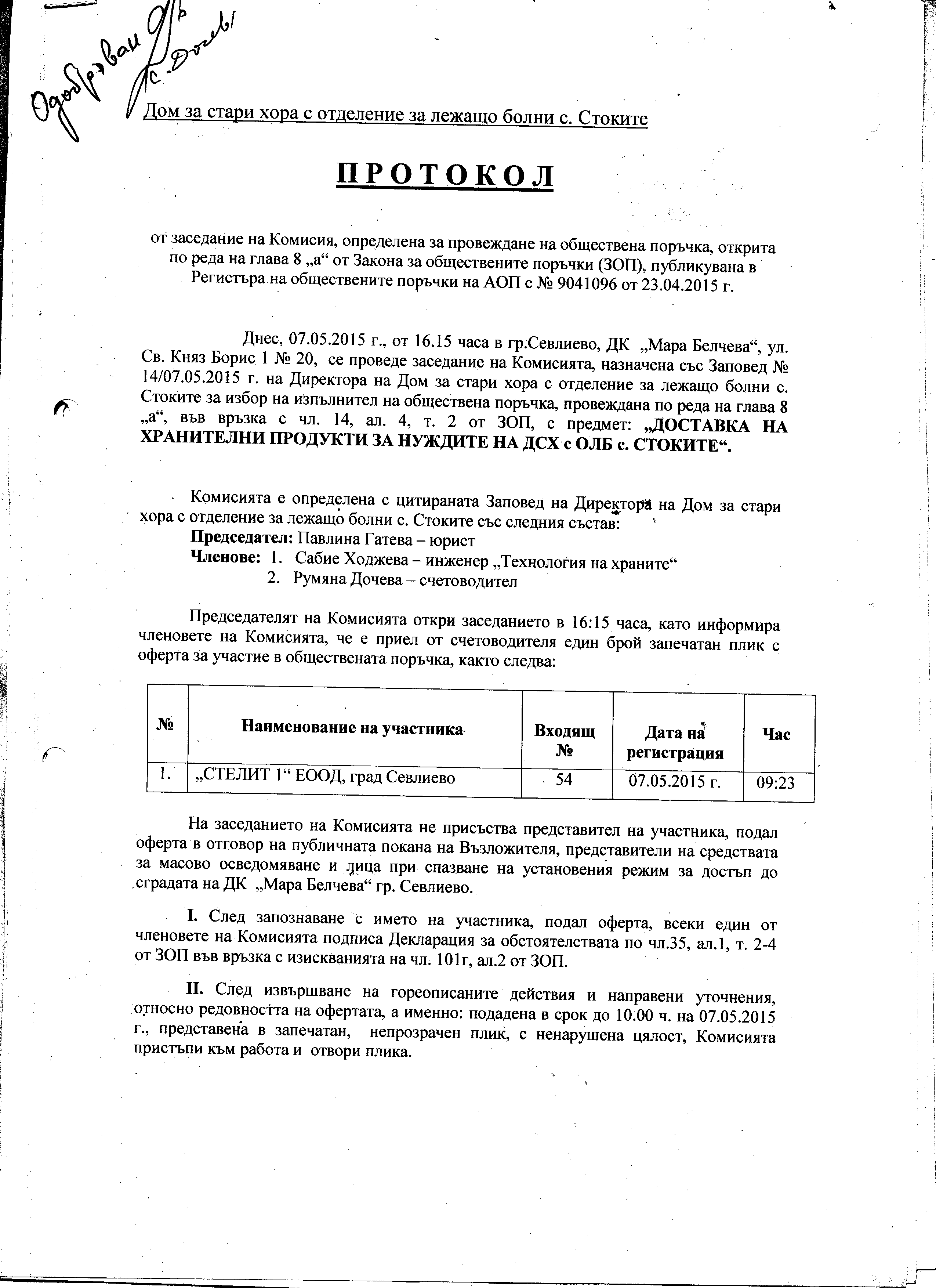 Протокол от заседание на комисия за избор на изпълнител, назначена със заповед №14/07.05.2015 на Директора на ДСХ с ОЛБ с.Стоките-file 1