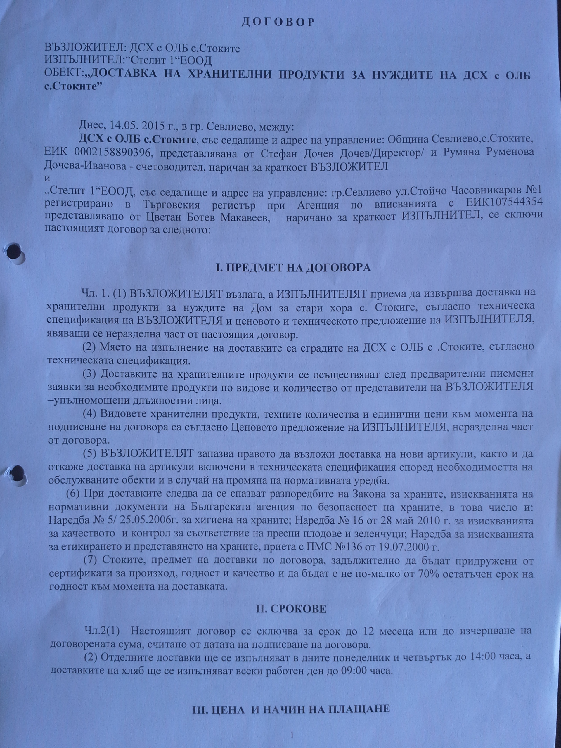„ДОСТАВКА НА ХРАНИТЕЛНИ ПРОДУКТИ ЗА НУЖДИТЕ НА ДСХ с ОЛБ с. СТОКИТЕ“