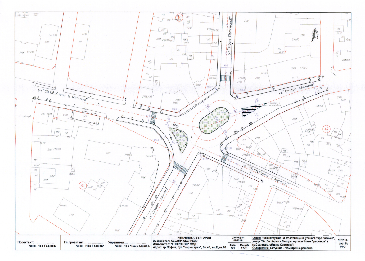 Общински съвет – Севлиево съгласува идейните проекти за реконструкция на кръстовището между улиците „Стара планина” , „Росица” и „Дунав” и на кръстовището между улиците „Стара планина”, „Св. св. Кирил и Методий” и „Иван Преснаков” в гр. Севлиево за създаване на кръгово движение. Предвижда се и на двете места островите, определящи кръговото движение, да имат елипсовидна форма и да бъдат поставени метални пластики на тема „Тиквени фантазии”. С тази цел Община Севлиево обявява конкурс за художествено оформление на новите кръстовища.