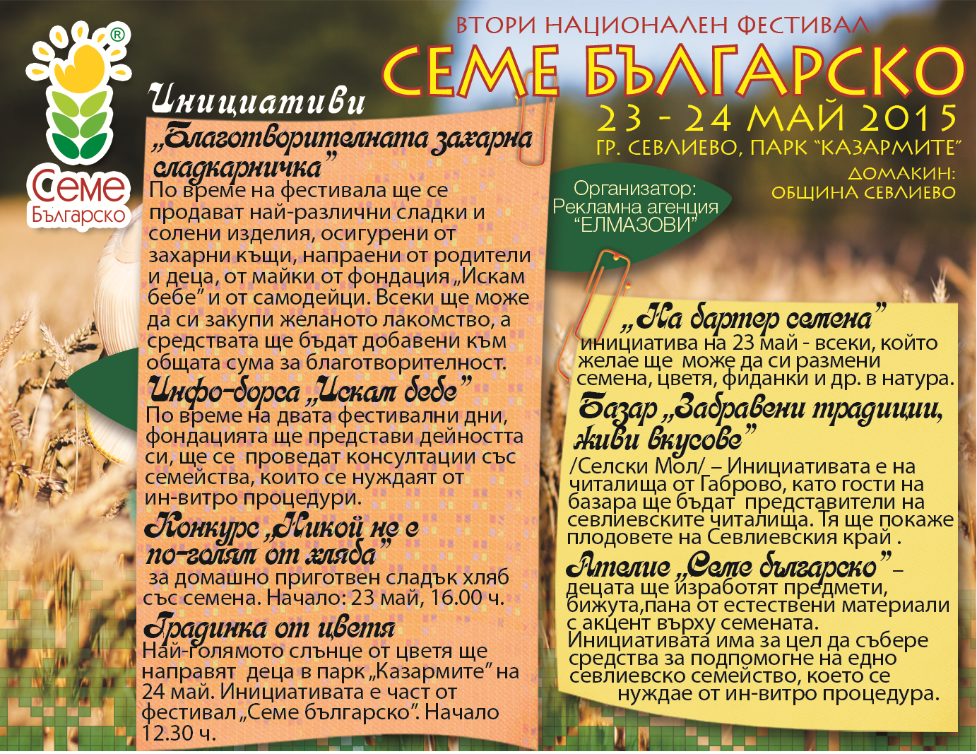 И през второто издание на фестивала Семе българско, който ще се проведе на 23 и 24 май в парк „Казармите“ ще продължим инициативата Ателие „Семе българско”. В него севлиевските деца ще изработят предмети, бижута, апликации, пана от естествени материали с акцент върху семената и растенията и т.н. Инициативата има за цел да събере средства за подпомогне на едно севлиевско семейство, което се нуждае от ин-витро процедура. В подкрепа на това, тази година надграждаме и с още нещо - „Благотворителната захарна сладкарничка”, на която ще се продават най-различни сладки и солени изделия, осигурени от захарни къщи от Севлиево, както и от родители и деца от детски градини и училища, от майки от фондация „Искам бебе” и от читалищни самодейци. Всеки ще може да си закупи желаното лакомство, а средствата от продажбите ще бъдат добавени към общата сума за благотворителност.
