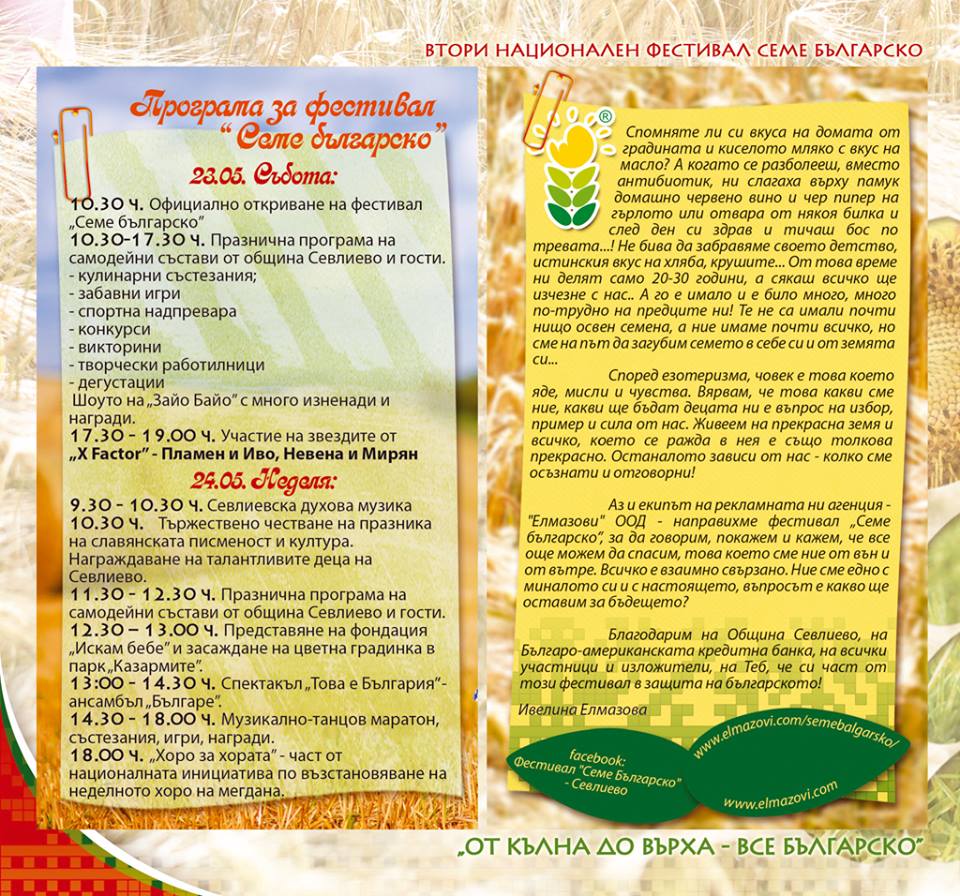 Министърът на земеделието и храните Десислава Танева заедно с кмета д-р Иван Иванов ще поставят началото на второто издание на националния фестивал „Семе българско“, който ще се проведе на 23 и 24 май в парк „Казармите“.