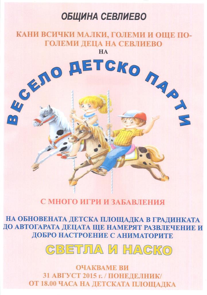 Пъстро детско парти с много игри и забави организира Община Севлиево в понеделник, 31 август, от 18.00 часа на обновената детска площадка в градинката до Автогарата. Празникът е за всички за малки, големи и още по-големи, като задължителното условие за всички е доброто настроение.