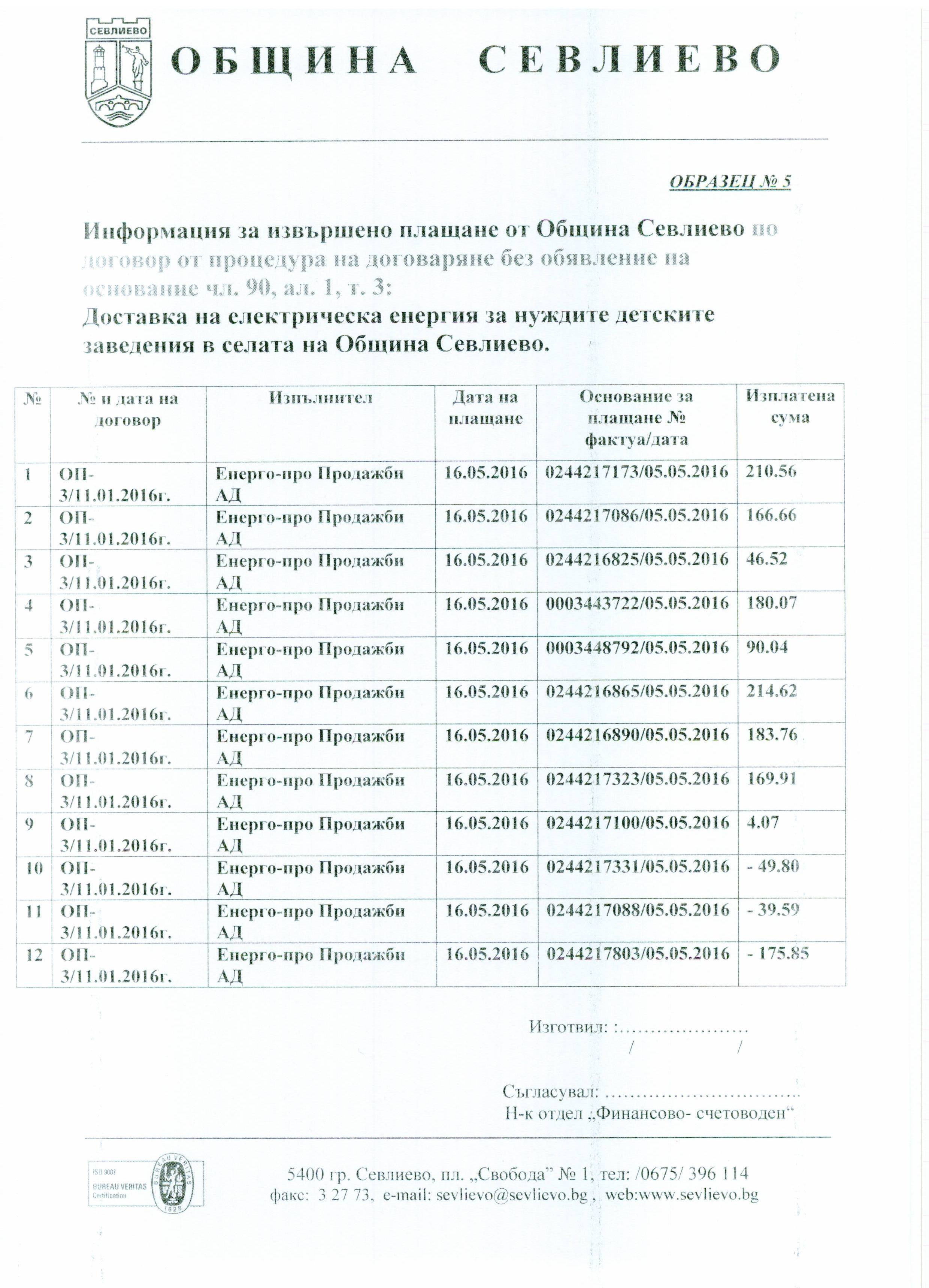 Информация за извършено плащане Информация за извършено плащане на ДСП - град Севлиево на 11-25.05.2016г.