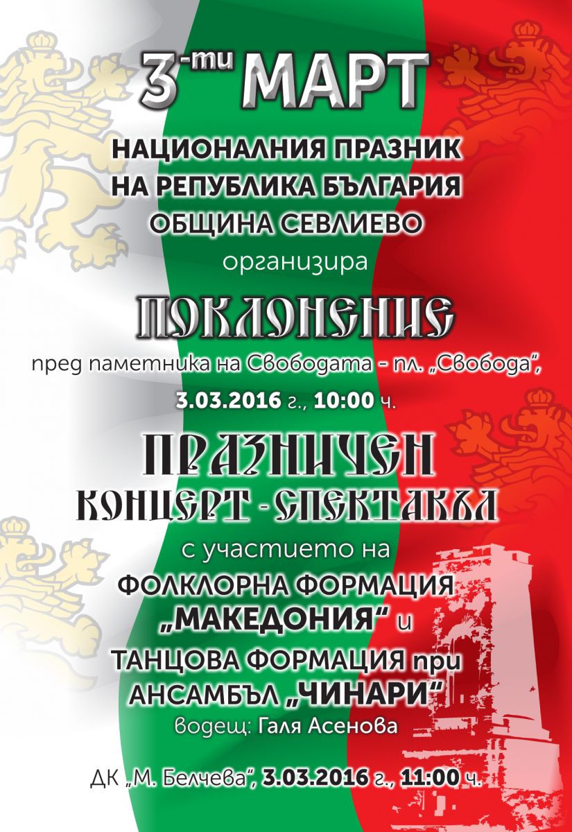 На 3 март, четвъртък, от 10:00 часа, пред паметника на Свободата ще се проведе тържествено честване на Националния празник на Република България – 3 март. Организатори на събитието са Община Севлиево и СОУ „Васил Левски“.
