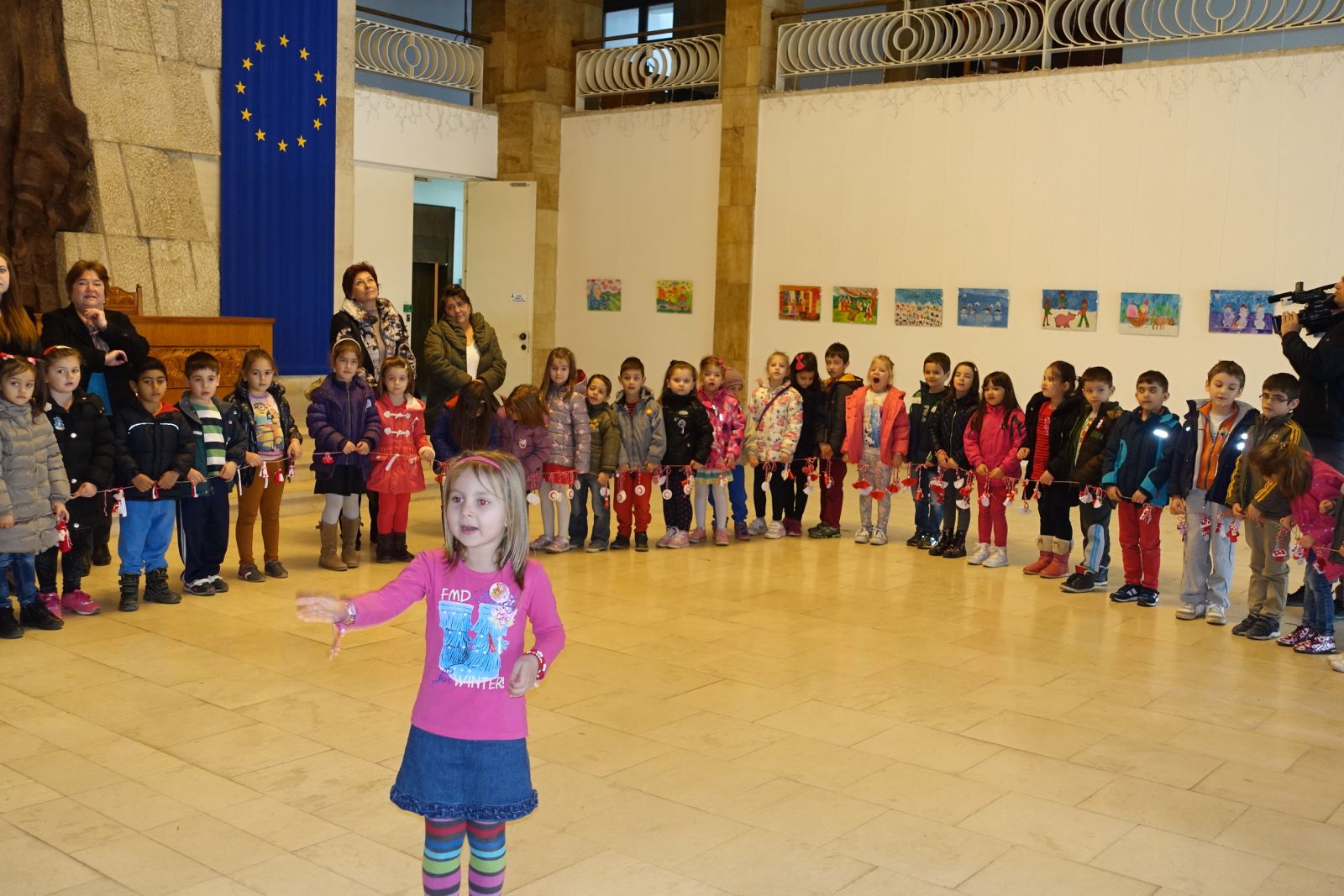 Повече от 30 деца от ОДЗ „Радост“ изпълниха фоайето на Община Севлиево, за да закичат с мартеници кмета д-р Иван Иванов и неговия екип. Малчуганите са изработили собственоръчно 10 - метрова мартеница, с която украсиха балкона в Общината.