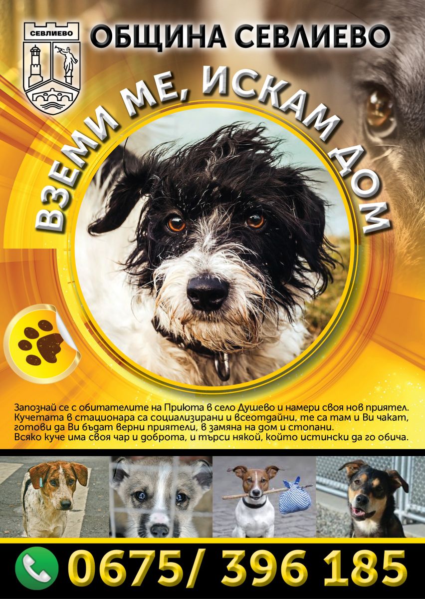 „ВЗЕМИ МЕ, ИСКАМ ДОМ“, под това мото Община Севлиево стартира кампания за осиновяване на безстопанствени кучета от Приюта в село Душево.