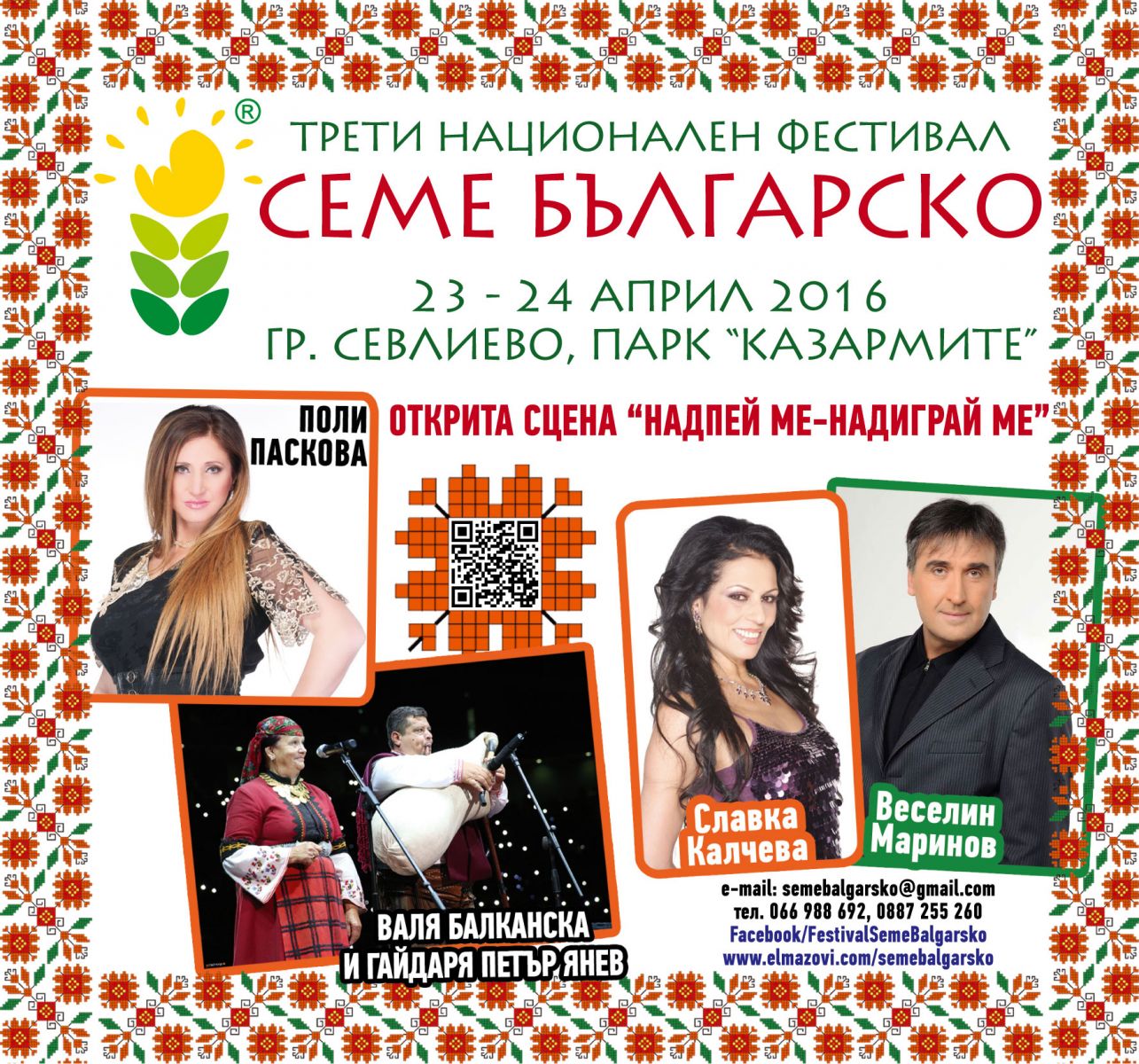 На 23 и 24 април, по време на третия национален фестивал „Семе българско“ в Севлиево ще отекнат гласовете на Валя Балканска, Поли Паскова, Веселин Маринов и Славка Калчева.