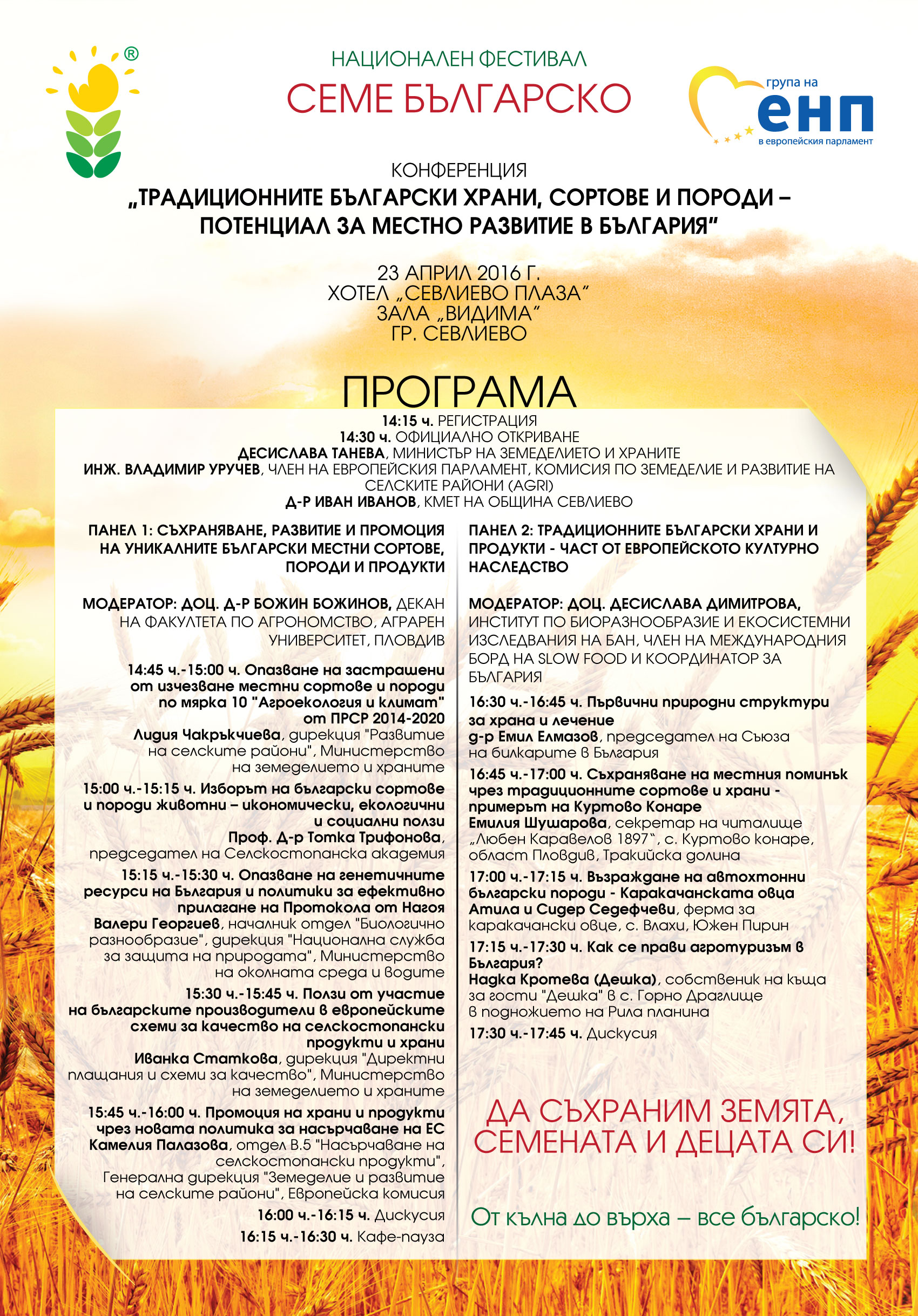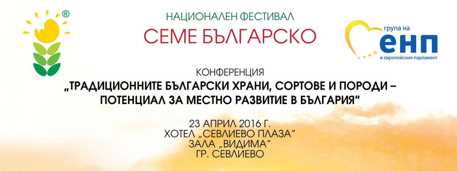Национална конференция „Традиционните български храни, сортове и породи - потенциал за местно развитие в България“ ще се проведе в Севлиево, като част от третия национален фестивал „Семе българско“. Събитието ще се проведе на 23 април 2016 г. от 14:30 часа в хотел Севлиево – Плаза.