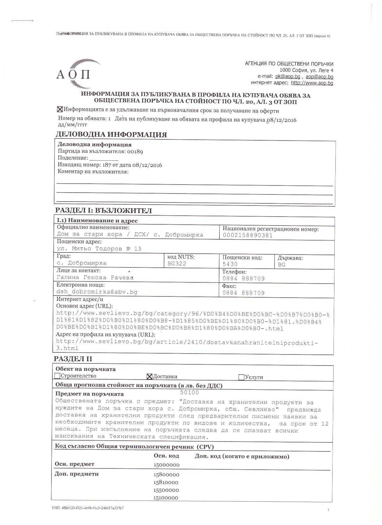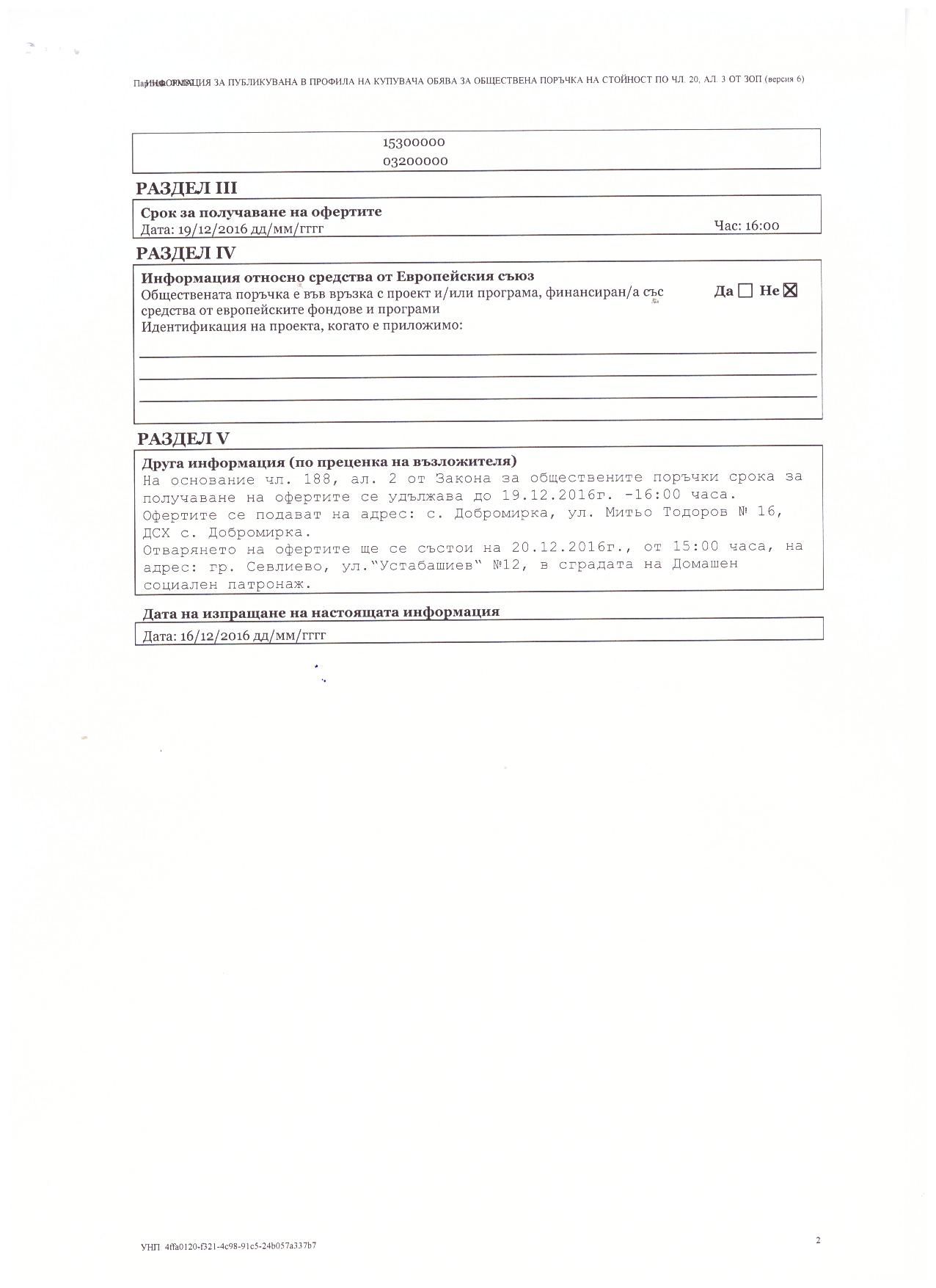 Удължаване на първоначалния срок за получаване на оферти по чл. 188 , ал.2 от ЗОП