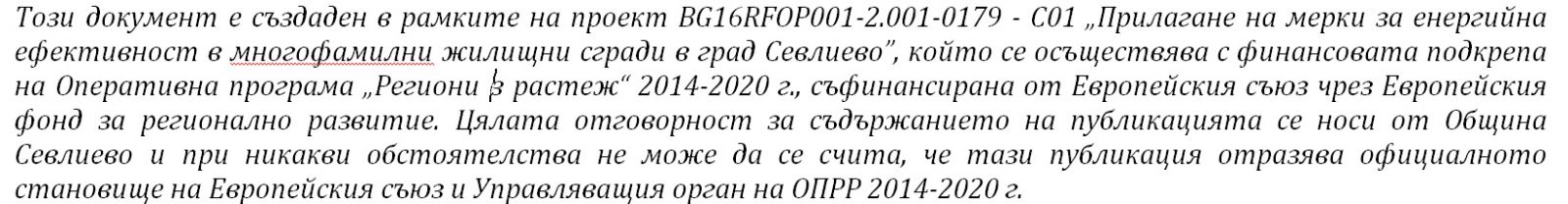 Проект „Прилагане на мерки за енергийна ефективност в многофамилни жилищни сгради в град Севлиево“, договор №BG16RFOP001-2.001-0179-С01 от 24.11.2016 г., се финансира от Оперативна програма „Региони в растеж“ 2014-2020 г., Приоритетна ос 2: „Подкрепа за енергийна ефективност в опорни центрове в периферните райони“, Процедура BG16RFOP001-2.001 „Енергийна ефективност в периферните райони“. Общата стойност на проекта е 4 660 845, 57 лв., от които 3 961 718, 73 лв. европейско и 699 126, 84 лв. национално съфинансиране.