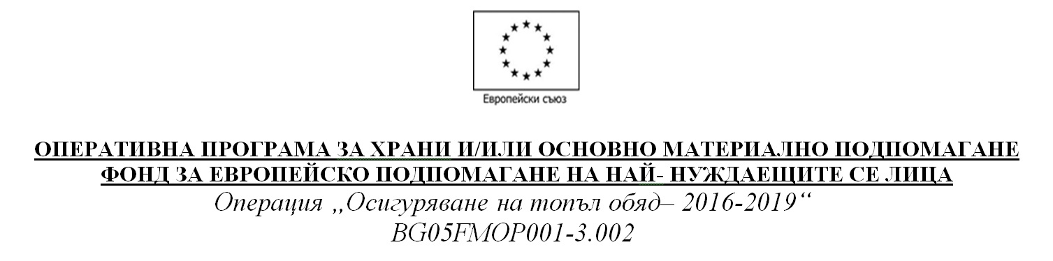 Във връзка с изпълнението на проект „Предоставяне на топъл обяд за нуждаещите се в община Севлиево“ по Оперативната програма за храни и/или основно материално подпомагане по Фонда за европейско подпомагане на най-нуждаещите се лица 2016-2019 г., Община Севлиево обявява прием на Заявления за ползване на социалната услуга „Топъл обяд“