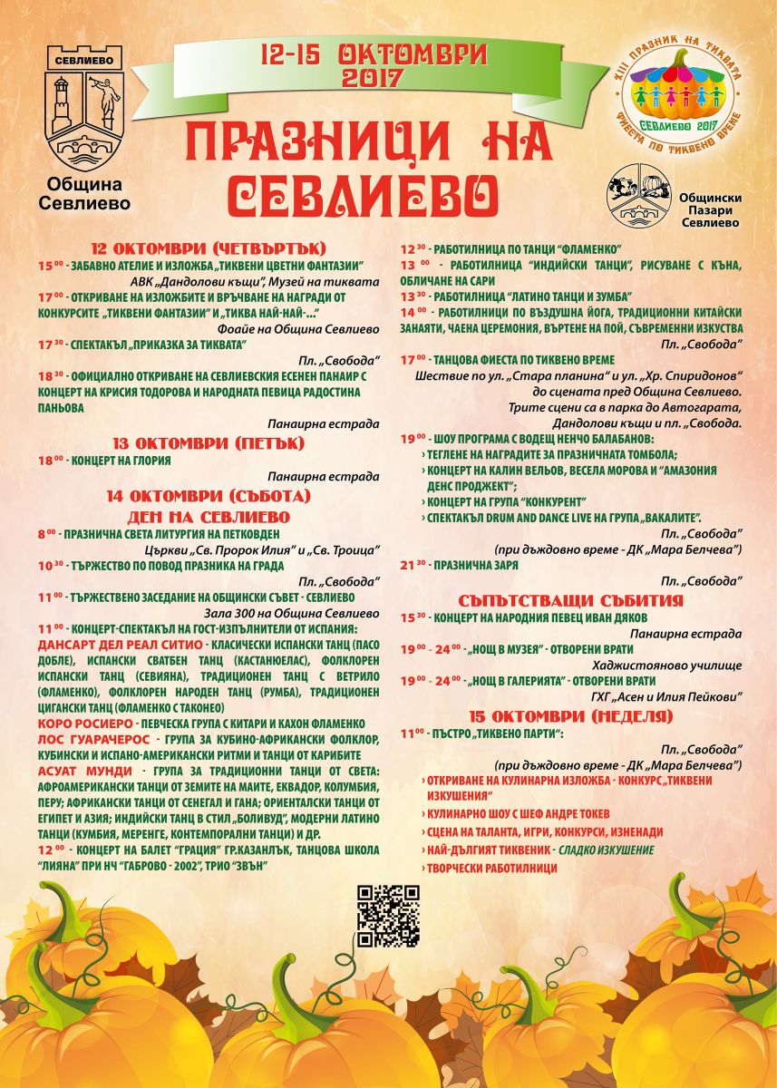 „Добре дошли в Севлиево – столица на тиквата” в дните от 12 до 15-ти октомври, когато са честванията, посветени на Деня на града, съпътствани от традиционния Празник на тиквата и от Севлиевския есенен панаир.