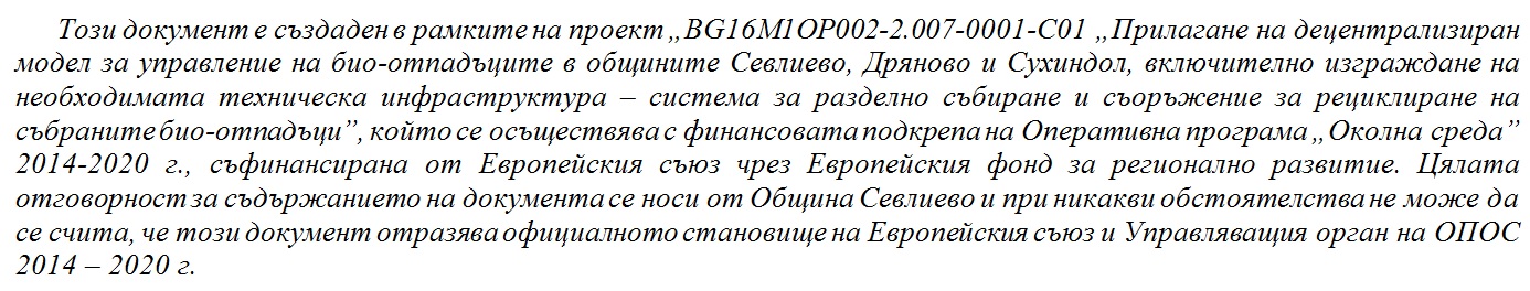 БИО-ОТПАДЪЦИТЕ В ОБЩИНИТЕ СЕВЛИЕВО, ДРЯНОВО И СУХИНДОЛ, ВКЛЮЧИТЕЛНО ИЗГРАЖДАНЕ НА НЕОБХОДИМАТА ТЕХНИЧЕСКА ИНФРАСТРУКТУРА–СИСТЕМА ЗА РАЗДЕЛНО СЪБИРАНЕ И СЪОРЪЖЕНИЕ ЗА РЕЦИКЛИРАНЕ НА СЪБРАНИТЕ БИО-ОТПАДЪЦИ