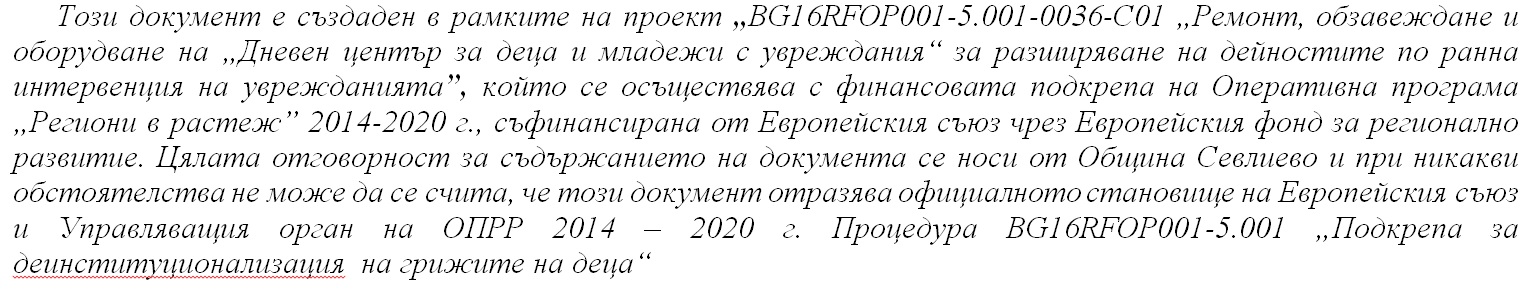 На 17 декември 2018 г. от 11:30 часа в зала 200 на Община Севлиево ще се проведе заключителна пресконференция по проект „BG16RFOP001-5.001-0036-C01 „Ремонт, обзавеждане и оборудване на „Дневен център за деца и младежи с увреждания“ за разширяване на дейностите по ранна интервенция на уврежданията”, финансиран по Оперативна програма „Региони в растеж” 2014-2020 г., съфинансиран от Европейския съюз чрез Европейския фонд за регионално развитие. Община Севлиево използва средства по Административен договор за предоставяне на безвъзмездна финансова помощ по оперативна програма "Региони в растеж" 2014- 2020, Процедура BG16RFOP001-5.001 „Подкрепа за деинституционализация на грижите на деца“ № от ИСУН BG16RFOP001-5.001-0036-C01 от 02.08.2018 г.