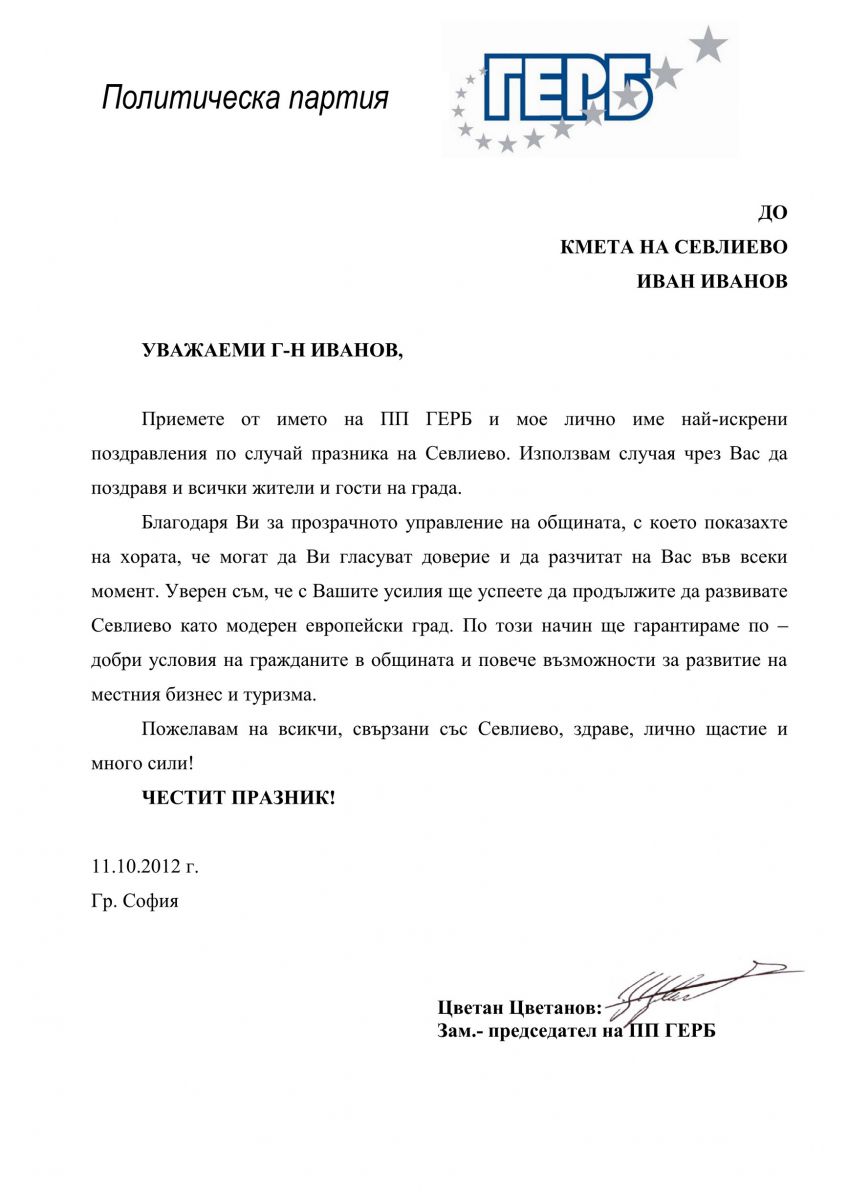 Кметът на Севлиево получи поздравителен адрес за празника на града от Цветан Цветанов