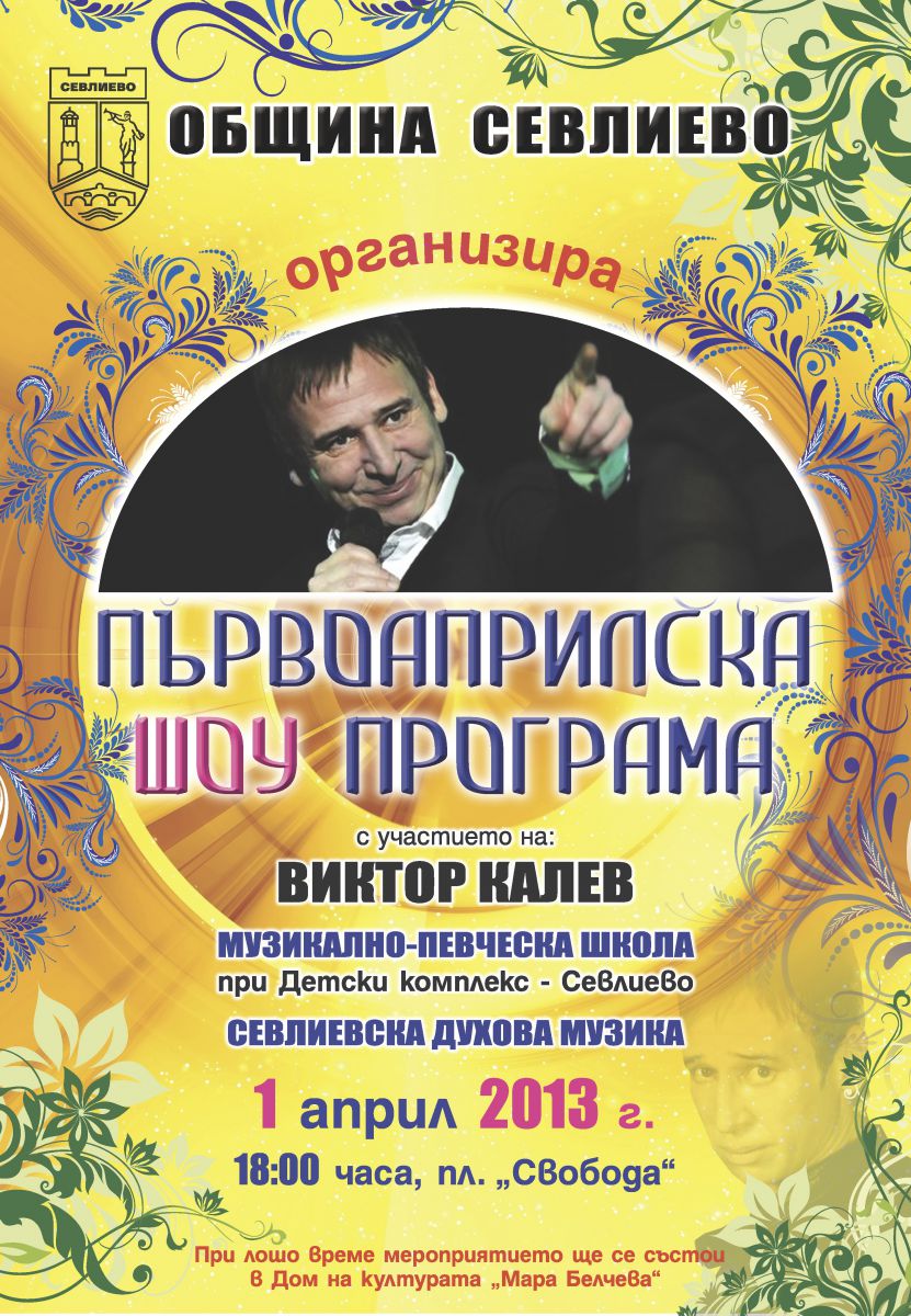 Специално за деня на шегата – 1 април, община Севлиево организира забавна първоаприлска шоу програма. Подгответе се за смях до сълзи с незабравимия актьор Виктор Калев. В програмата ще участват още музикално – певческа школа при Детски комплекс – Севлиево и Севлиевска духова музика.
