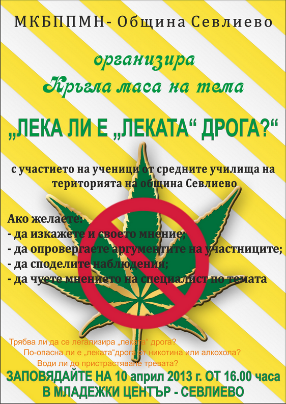 Местната комисия за борба срещу противообществените прояви на малолетните и непълнолетните при община Севлиево организира кръгла маса на тема „Лека ли е „леката” дрога?”. Събитието ще се проведе на 10 април /сряда/ от 16. 00 часа в сградата на Младежки център – Севлиево.