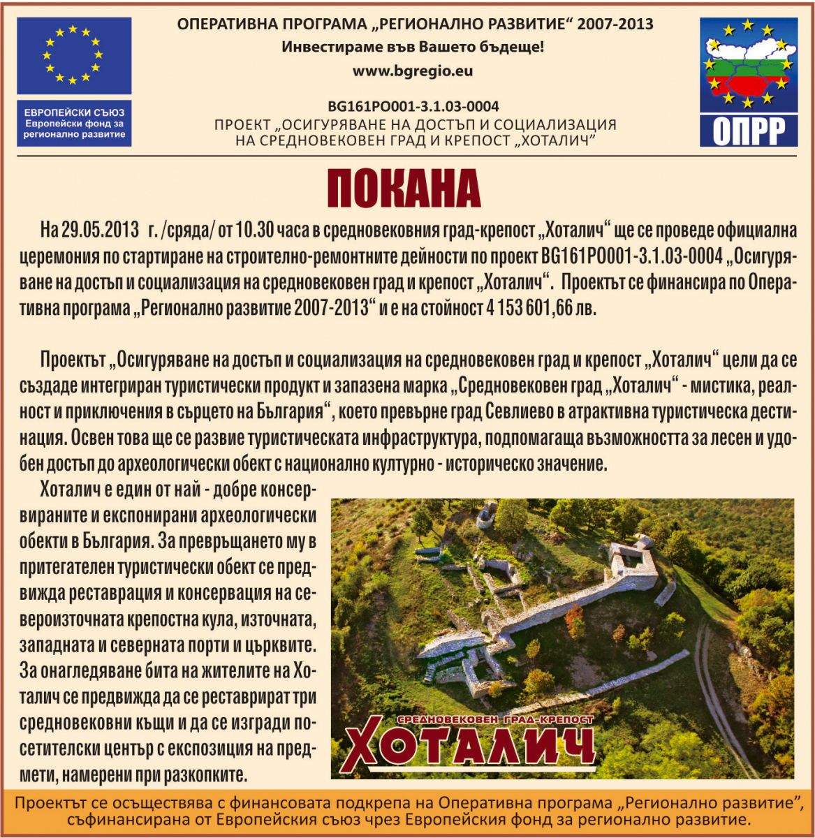 Покана за "Първа копка" по проект „Осигуряване на достъп и социализация на средновековен град и крепост „Хоталич”