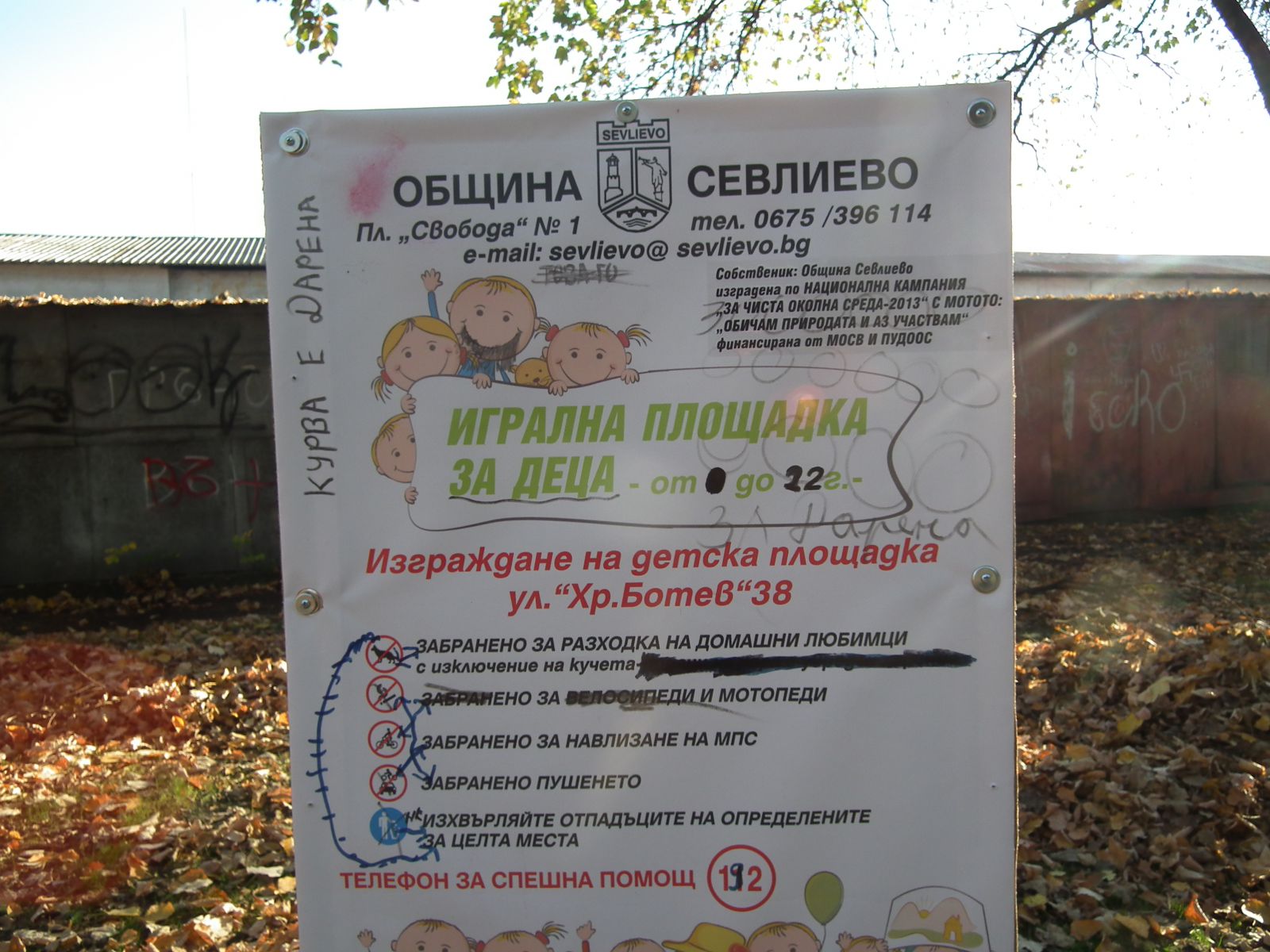 Детската площадка, която се намира на ул. “Христо Ботев“ № 38 е обект на вандалски прояви за втори път през този месец. По незавършения все още детски кът има изпочупени седалки и хулигански прояви по детските съоръжения. Желанието от страна на Община Севлиево бе да възстанови и направи мястото привлекателно и удобно за игра на децата. Такова е и намерението на живущите в района, които изразиха желание тази детската площадка да бъде възстановена.