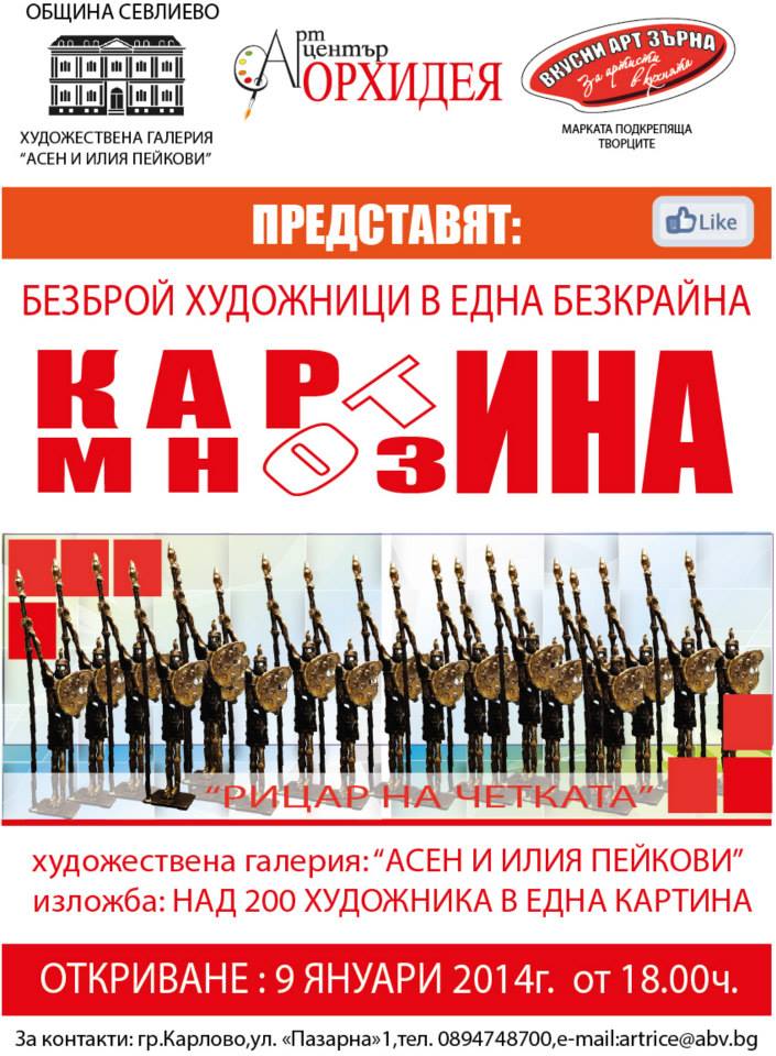 Утре, 9 януари от 18.00 ч. ще бъде открита първата изложба в ХГ "Асен и Илия Пейкови" за 2014 г.   Името "Картина от мнозина" обединява повече от 200 художника от страната и чужбина. Проектът е на АРТ-ЦЕНТЪР "Орхидея" – Карлово и има за цел да популяризира съвременното българско изкуство.